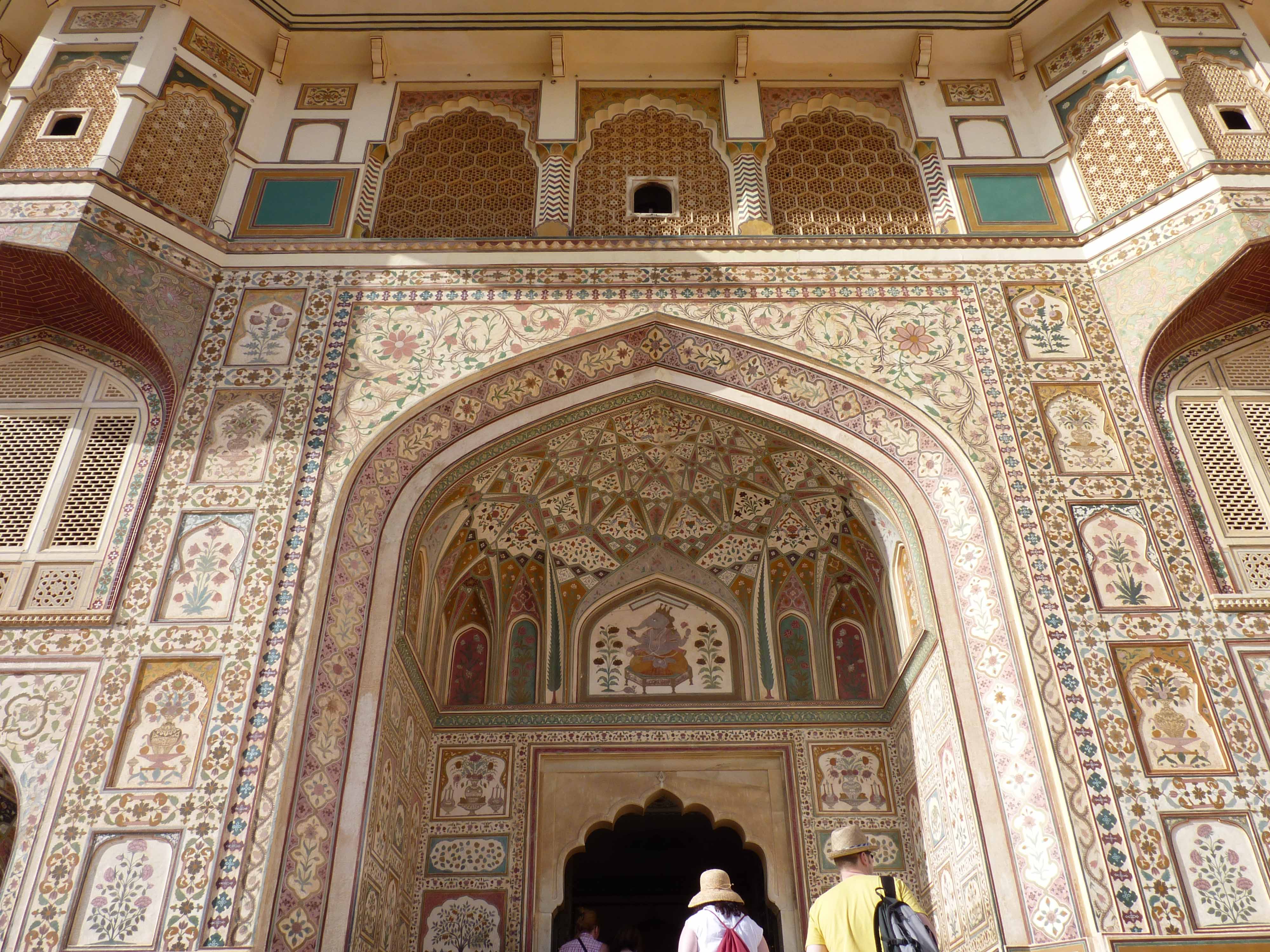 We entered the Jaleb Chowk, (the square), via the “sungate”, this area being originally the parade ground. After a rather ungainly dismount of our elephant we assembled in the growing heat and massing crowds waiting to access the fort proper. After a brief talk from our guide Dilip we approached the magnificent ‘Ganesh Pol‘. This is a shimmering three-storied gateway built-in 1640 which leads through to the private apartments and a screened upper floor where the ladies could get a glimpse of the outside world below.