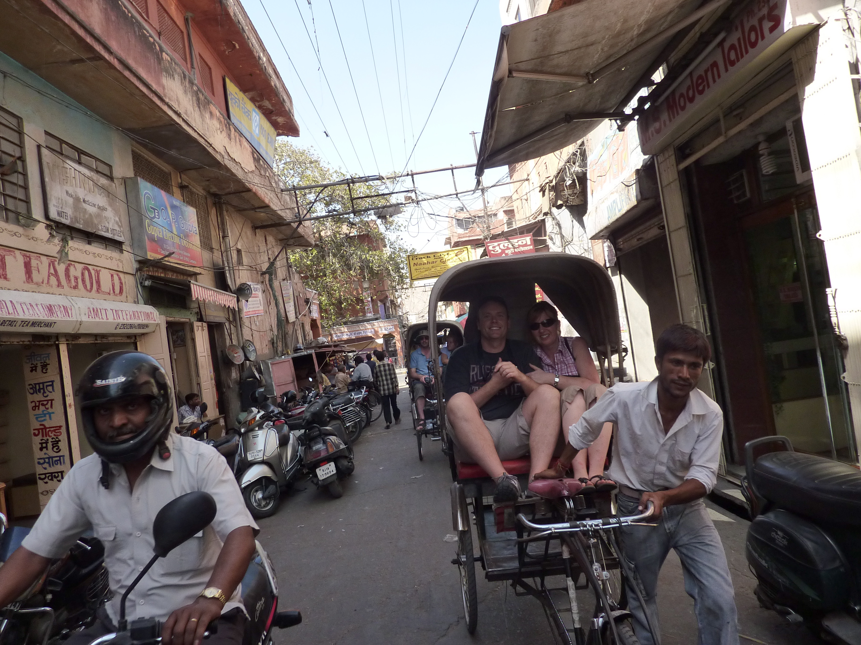 Having marvelled at the madness and magnificence of it all we were then hurried over to some waiting rickshaws which were to take us on a perilous ride through the back streets of Jaipur. Our driver had broken flip-flops, not the best footwear when pedalling quickly upon a bike, and a tendency to cough up large mouthfuls of phlegm which were deposited on the road at regular 2 minute intervals. Occasionally some of this phlegm made its way through the air and into my face as we raced around the various roundabouts and narrow alleys of Jaipur! No punches were pulled on this little trip and all the good and bad of street life was laid bare in front of us to see. Wildlife cohabited the streets with the humans as ever in India and monkeys hung from electricity lines suspended above us while we veered to and fro to avoid sacred cows and evade hitting wild pigs snorting around the kerb-sides of the potholed pavements. The smells passed through our nostrils, some good, some not so good and on we sped through the streets.