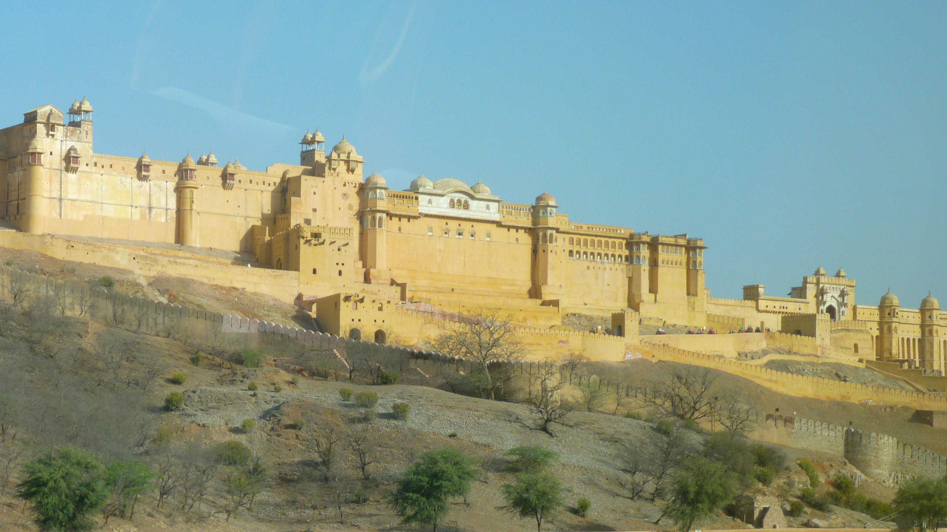 The fort itself is gained by a precipitous elephant ride up a narrow cobbled path. Clambering up some steep steps to the elephant mount we locked ourselves into the cradle a top a fine beast ready for our ride up to the imposing fort. The next 20 minutes consisted of many yells and squeals from Tracy as she convinced herself she was about to be toppled from her perch high up on this elephant. We are told that the elephants only do 5 trips up a day which if true helped ease our guilt at placing our not inconsiderable combined western weight on these poor creatures backs. Deep down though I feel that the Indian race will tell you almost anything that you want to hear, especially when Rupee’s are involved! Maybe this is a disservice but many a time it certainly felt that way, but as we were on an Indian adventure we entered into the spirit of the moment and rode the beasts of burden to the hot crest of the hill.