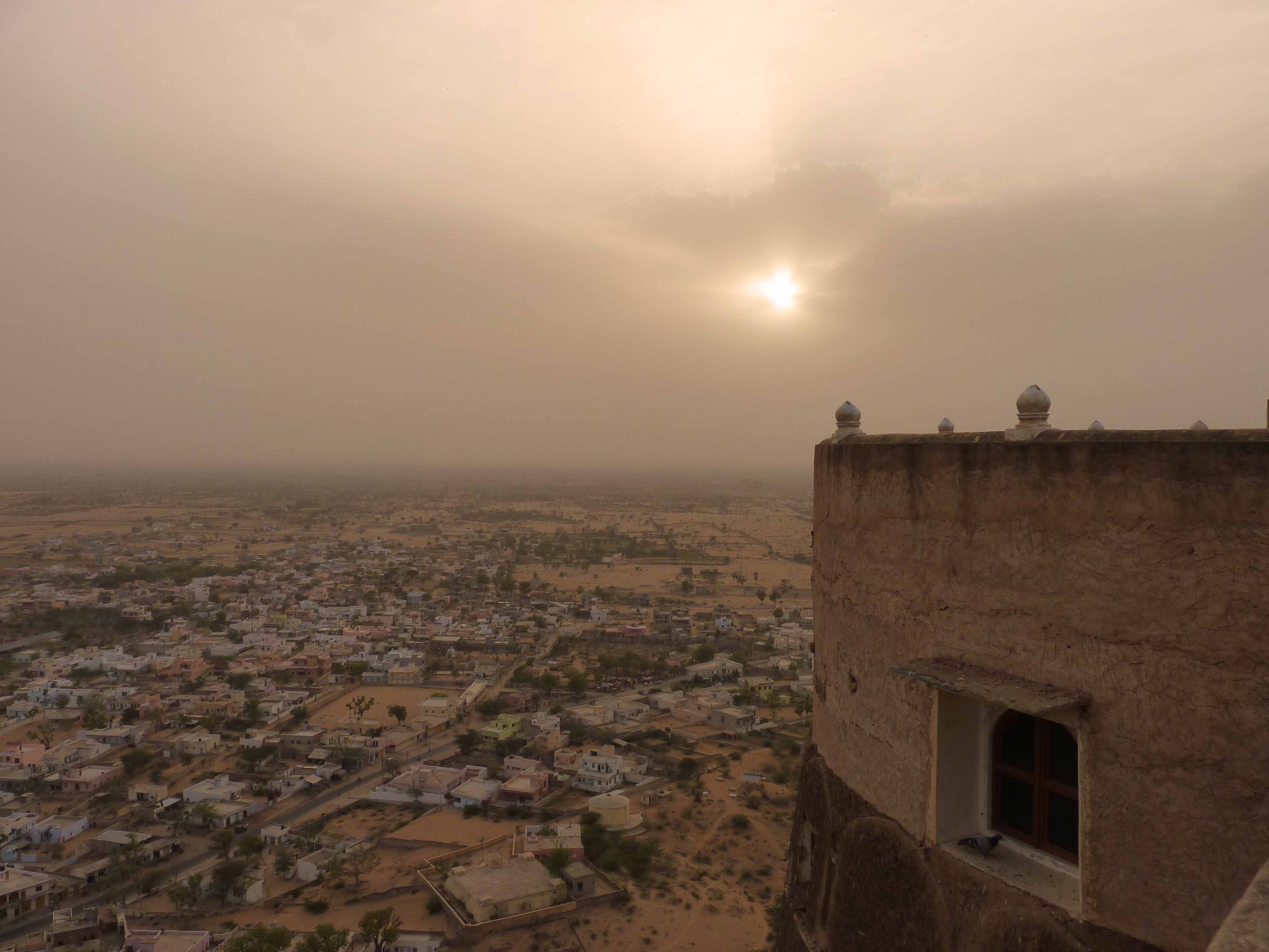 We flopped down on the bed and opened the tiny wooden shutters to the view of the desert way below and the ensuing sand storm that was now developing and beginning to engulf the mountains in the far distance. Candles were lit and we lay there letting the wind whistle through the tiny windows and blow refreshingly over our bodies cooling us down in the heat of the Indian afternoon.