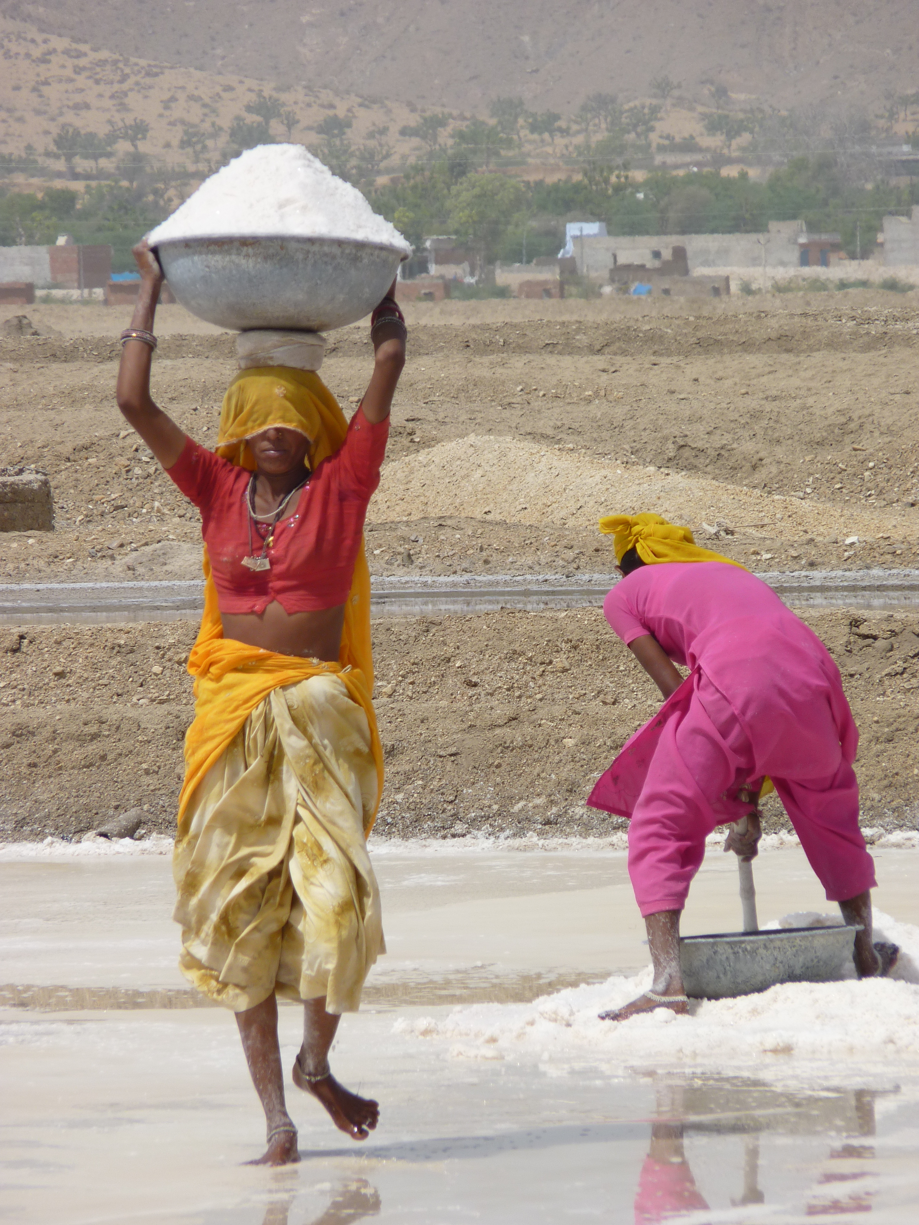 As soon as we were stationary the heat intensified dramatically and very British sun hats became the order of the day. To add to our embarrassment we then bore witness to the amazing sight of two young girls slaving away under the hot sun, shovelling tons of salt onto blankets which were then tied up and placed upon their heads, and then carried to the other side of the salt fields and dumped into another pile, which again was presumably shovelled up and moved to somewhere else. The grace and fortitude shown by these young ladies in such extreme and harsh conditions put our closeted western jobs into full perspective, we watched in equal parts of both wonder and shame.