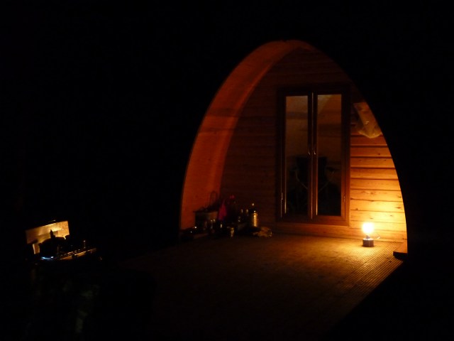 The Pods come equipped with a pretty useless lamp which is way below par for reading but does (I admit) lend a warming glow to the place, my advice though is remember to take a powerful tent lamp with you, battery powered, as gas burners are for obvious reasons not allowed inside the Pod.
