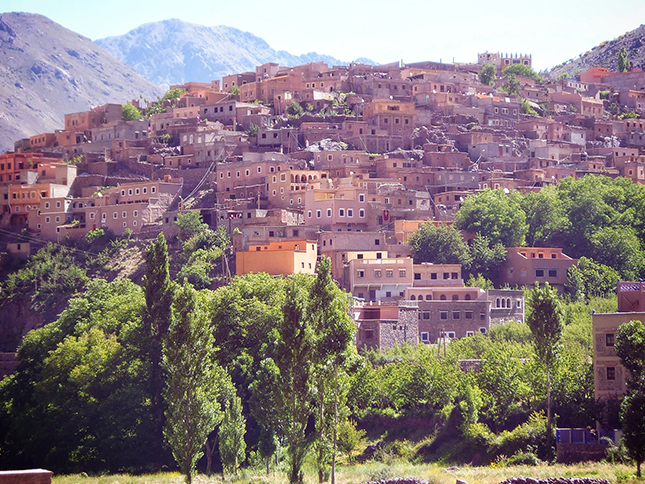 I soon found myself passing by very typical looking Moroccan homes and shops with their wares displayed out front on the dusty roads. We passed children playing in the lanes and fields, donkeys passed us laiden with baskets containing nuts and fruit and soft drinks either going into town or heading like us up to the refuge. We turned several corners and ascended several gentle slopes before we caught our first glimpse of Around. Around is the last of the series of villages that make up the trail head in the Mizan Valley. This amazing village is perched precariously on the slopes of the surrounding hills making picture perfect opportunities for the traveller with a camera.