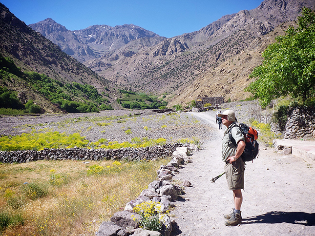 I arrived with my new best friends in the village of Imlil. Imlil is the gateway to the Atlas Mountains and the start point for our trek. From here on in there was only one way and it all led uphill! We all stocked up on water supplies from a small tea shop on the edge of the main street through the village while our newly acquired muleteer loaded up our mule for the journey. Our main holdalls would be carried by mule up to the Neltner Refuge, beyond that point the mule don’t go, so we would be carrying our daysacks from that point on.