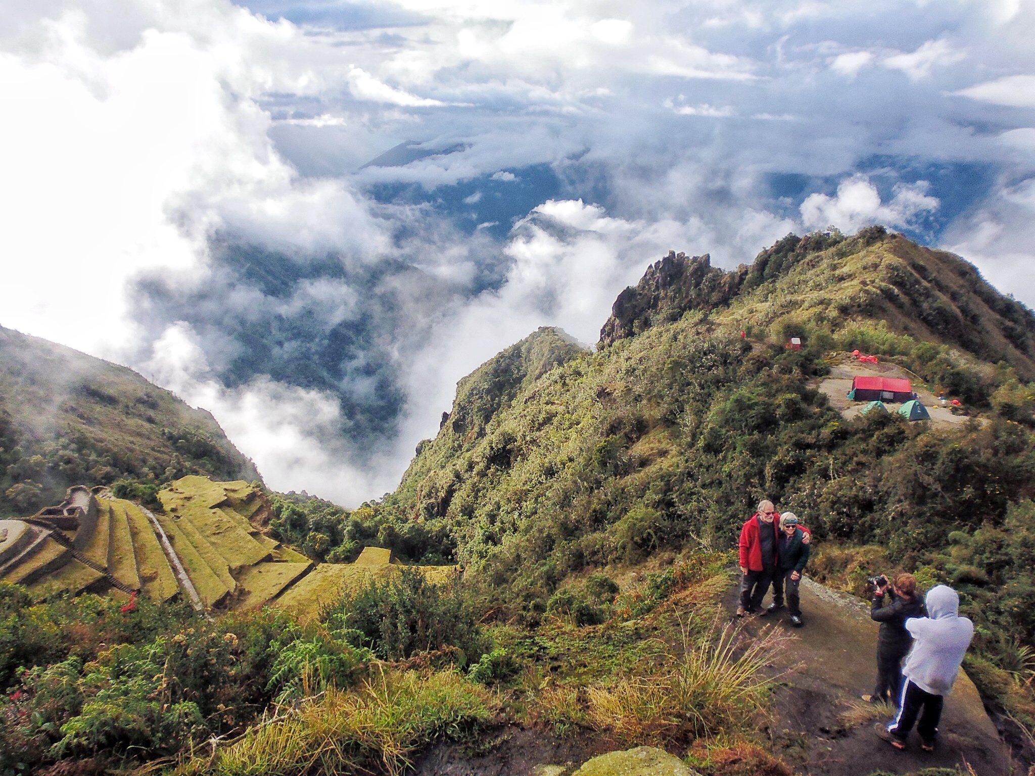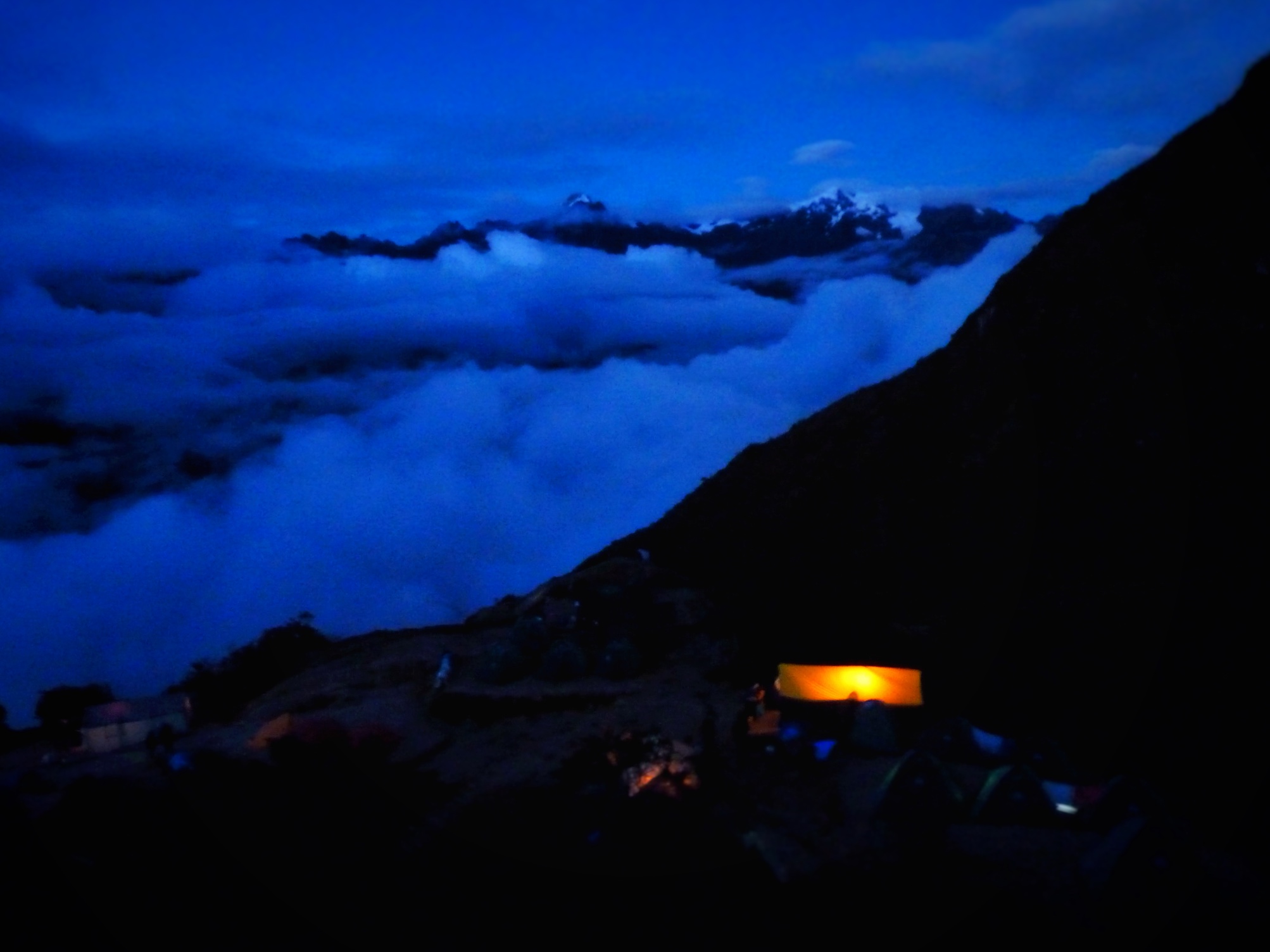 We climbed up to the 3rd pass (3,700m). The view from the pass (so I’m told) offers excellent views of several snow-capped peaks including Salkantay (6,271m) and Veronica (5,750m) but on a day like today with cloud and clag all views were obscured. A few more minutes after the pass are the ruins of Phuyupatamarca, and our campsite for the night. We would camp at (3,600m) our second highest camp on the trek. The name means ‘Town in the Clouds’ and it certainly lived up to it’s billing.