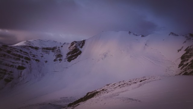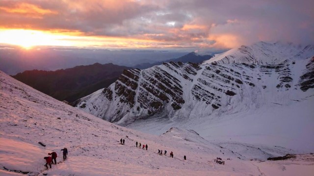 Rather miraculously and unscathed we emerged just below the col as daybreak lit up the dark sky. The whole mountain lit up in a pinkish red glow as the sunbeams pierced the battlements of the surrounding peaks. The snowy mountains and the natural amphitheatre they created were suddenly illuminated as if by spotlights.