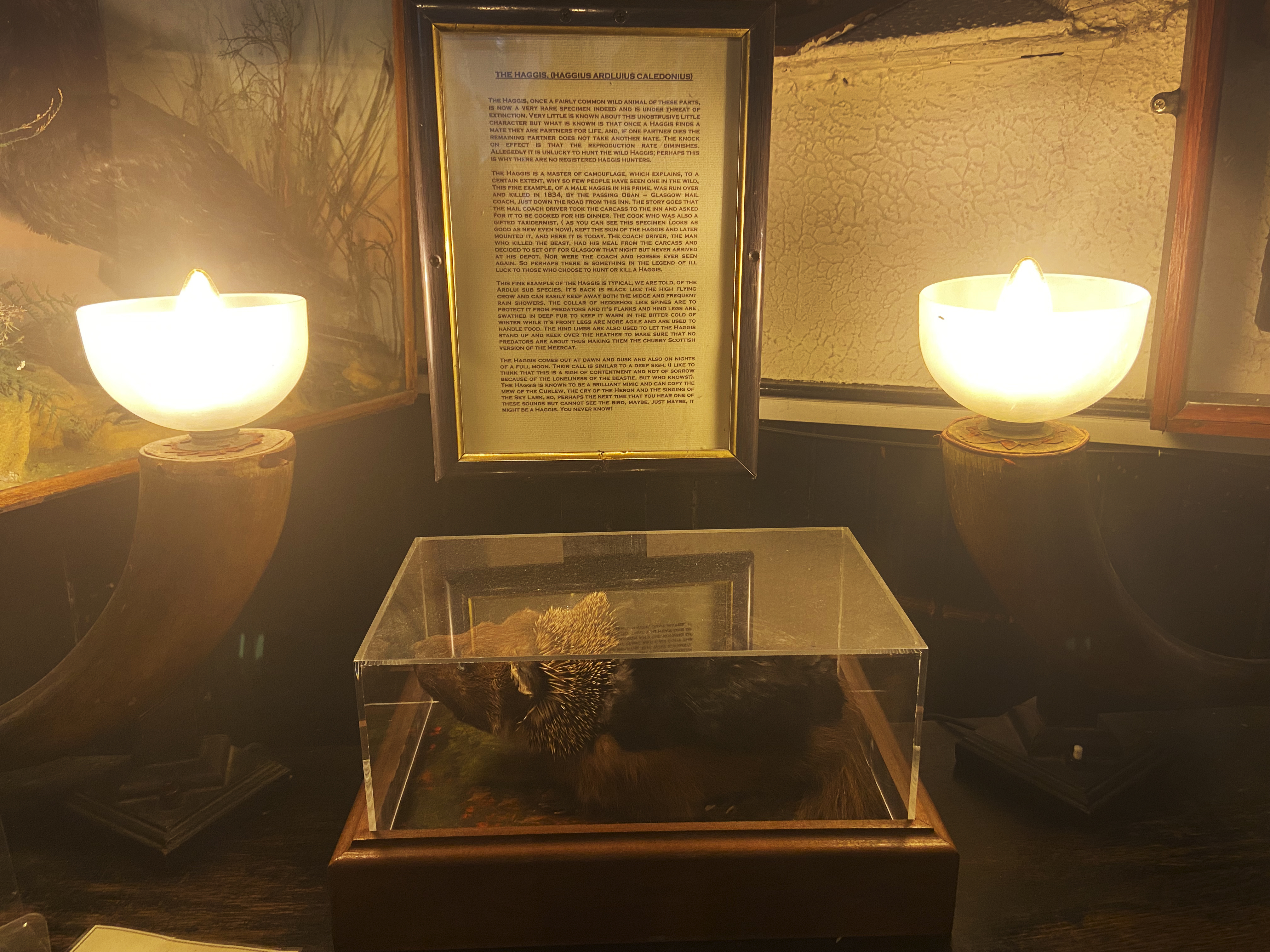 ‘The decor and furniture, in deference to the past, remain as authentic as The Drovers itself’ or in other words old and tatty. As you enter the reception hall you are faced with a full grown, stuffed grizzly bear, an assortment of other animals including a ‘Haggis‘ and the assured feeling that this place is going to stay in your consciousness for a long time to come. The inn was unnervingly named as one of Scotland’s most haunted pubs by The Scotsman.