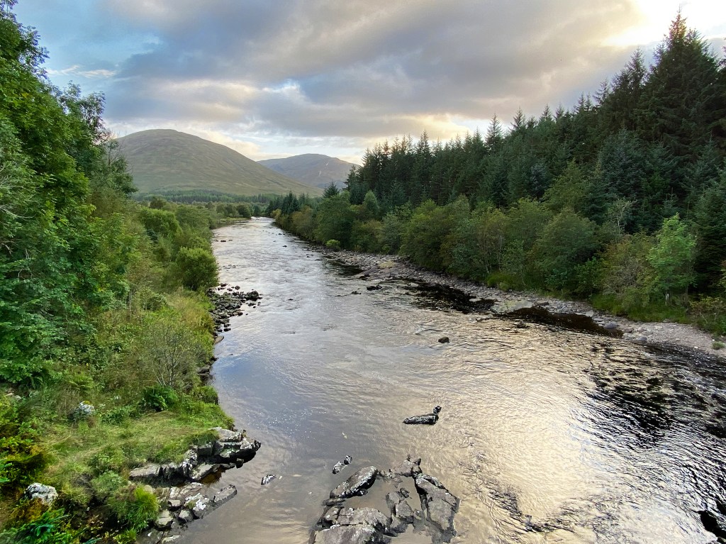 Day 6 and it was a beautiful morning as we stirred ready to leave the wooden cabin that we had been staying in by the riverside in the grounds of the Bridge of Orchy hotel. We had a perfect view of the bridge and the river which ran out of Loch Tulla from our cabin bed. I was eager for today’s stretch as we would be heading up past the lovely Loch Tulla and onto the wild and desolate Rannoch Moor.