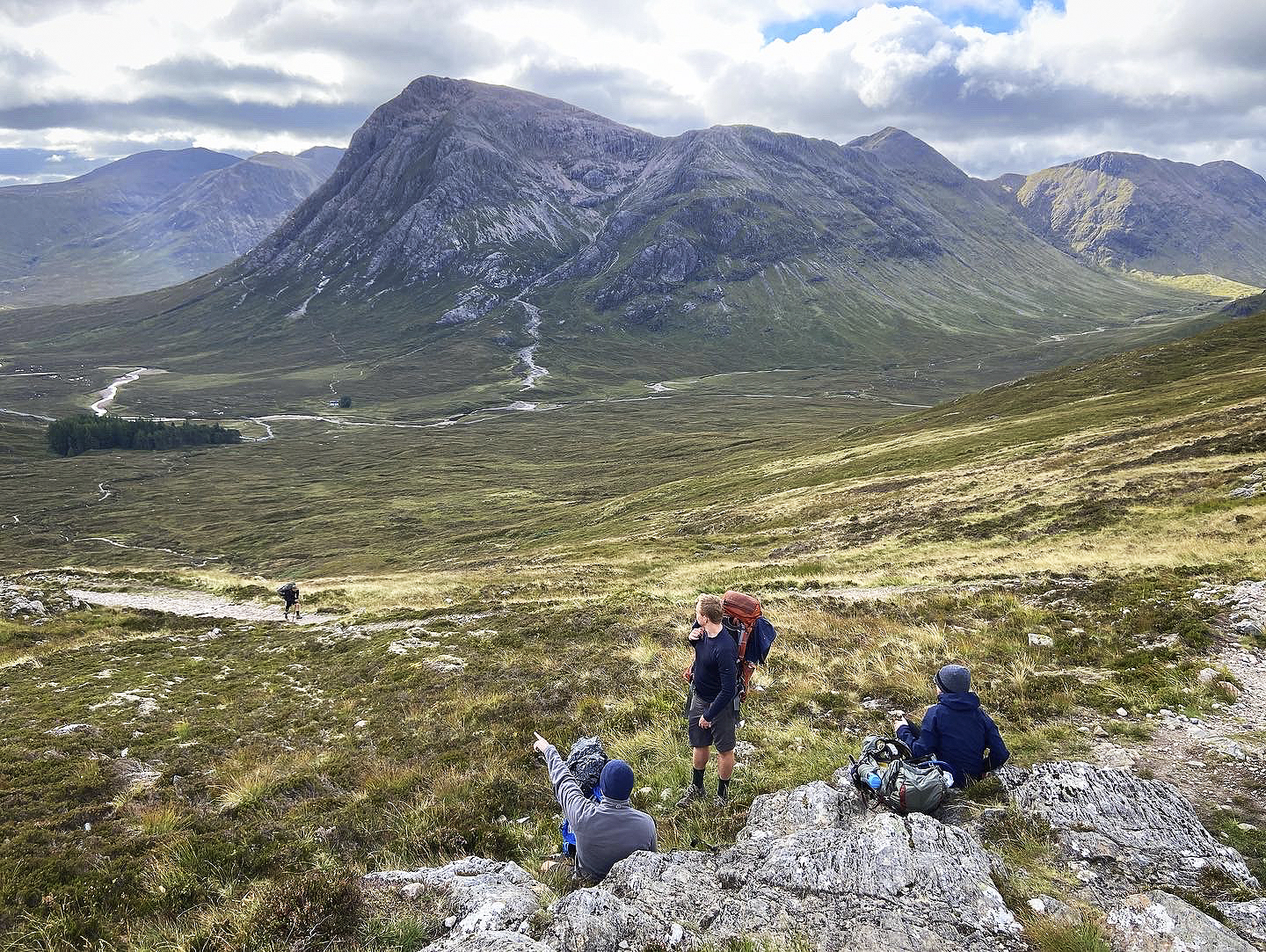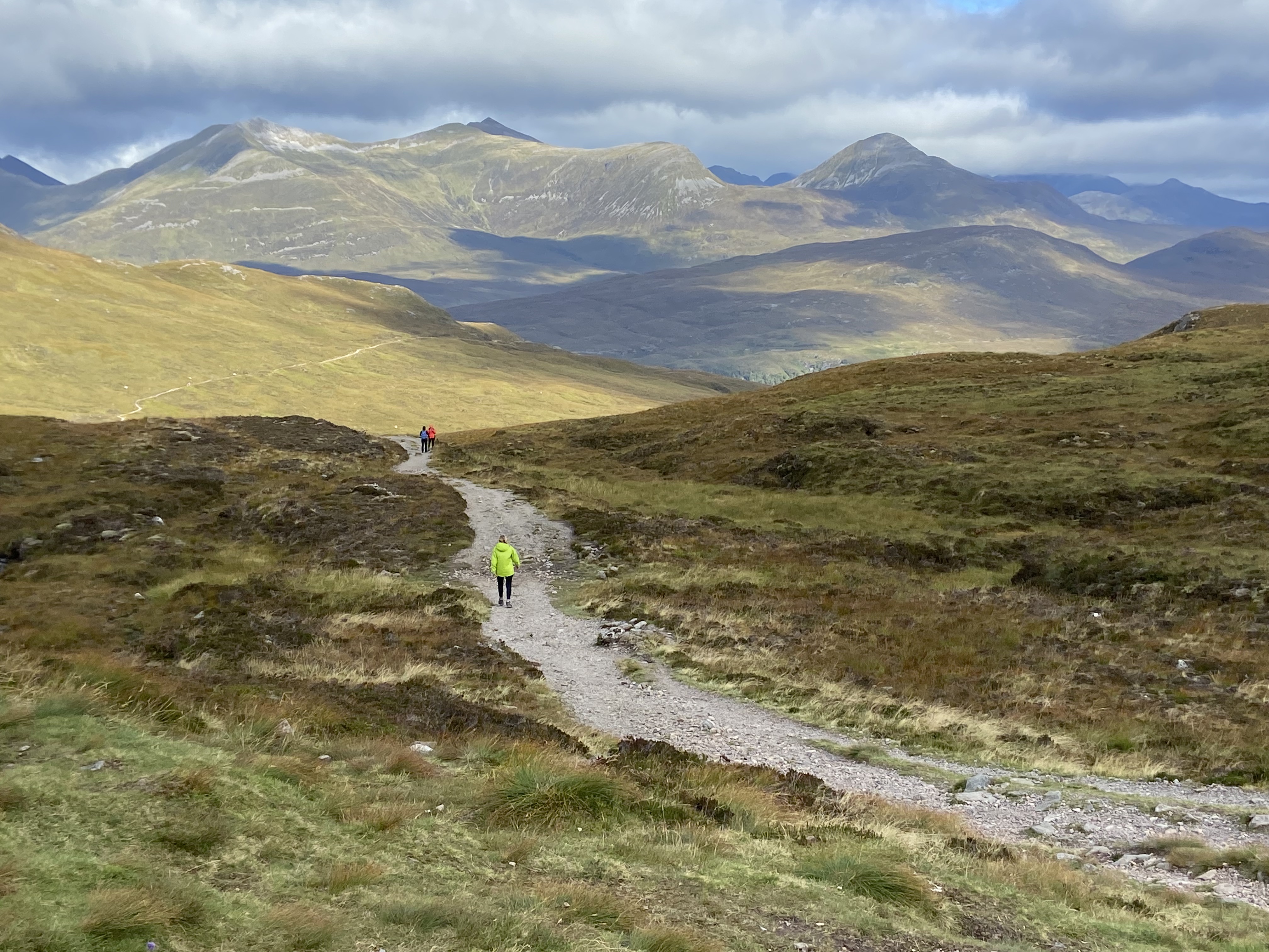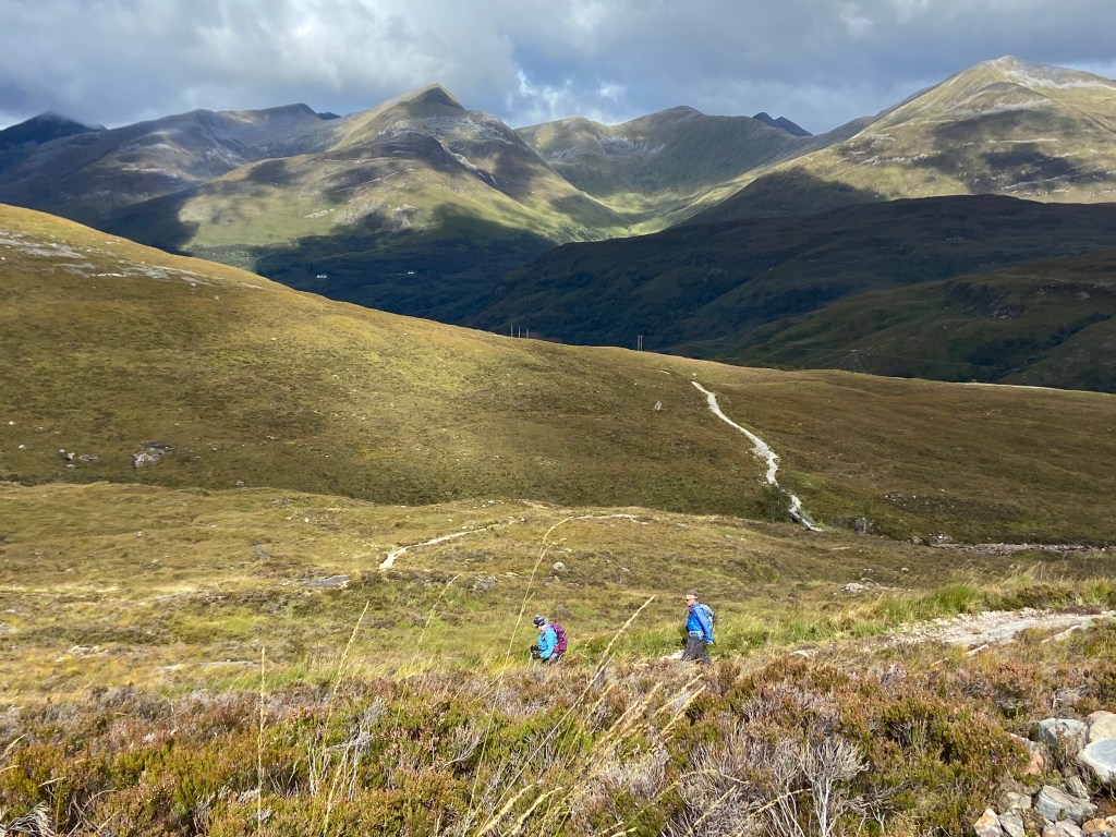 Gathering our breath for the big push we knew was surely coming we started to zigzag up the infamous Devil’s Staircase. Climbing steadily we breathlessly topped out at the highpoint of the entire West Highland Way the 548m cairned gap between Beinn Bheag and Stob Mhic Mhartuin. We were rewarded for our efforts with stunning views towards Ben Nevis still a small speck far away in the distance.