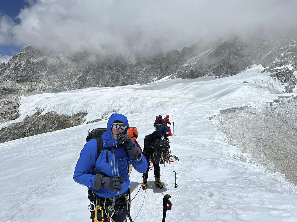 Remember those fixed lines I mentioned earlier on the way up? Well Mera had a scare in store for me as one of the ice-screws holding the roped line in place popped out of the glacier’s ice as I passed through it. I dangled precariously like a rag doll hanging from the glacier.