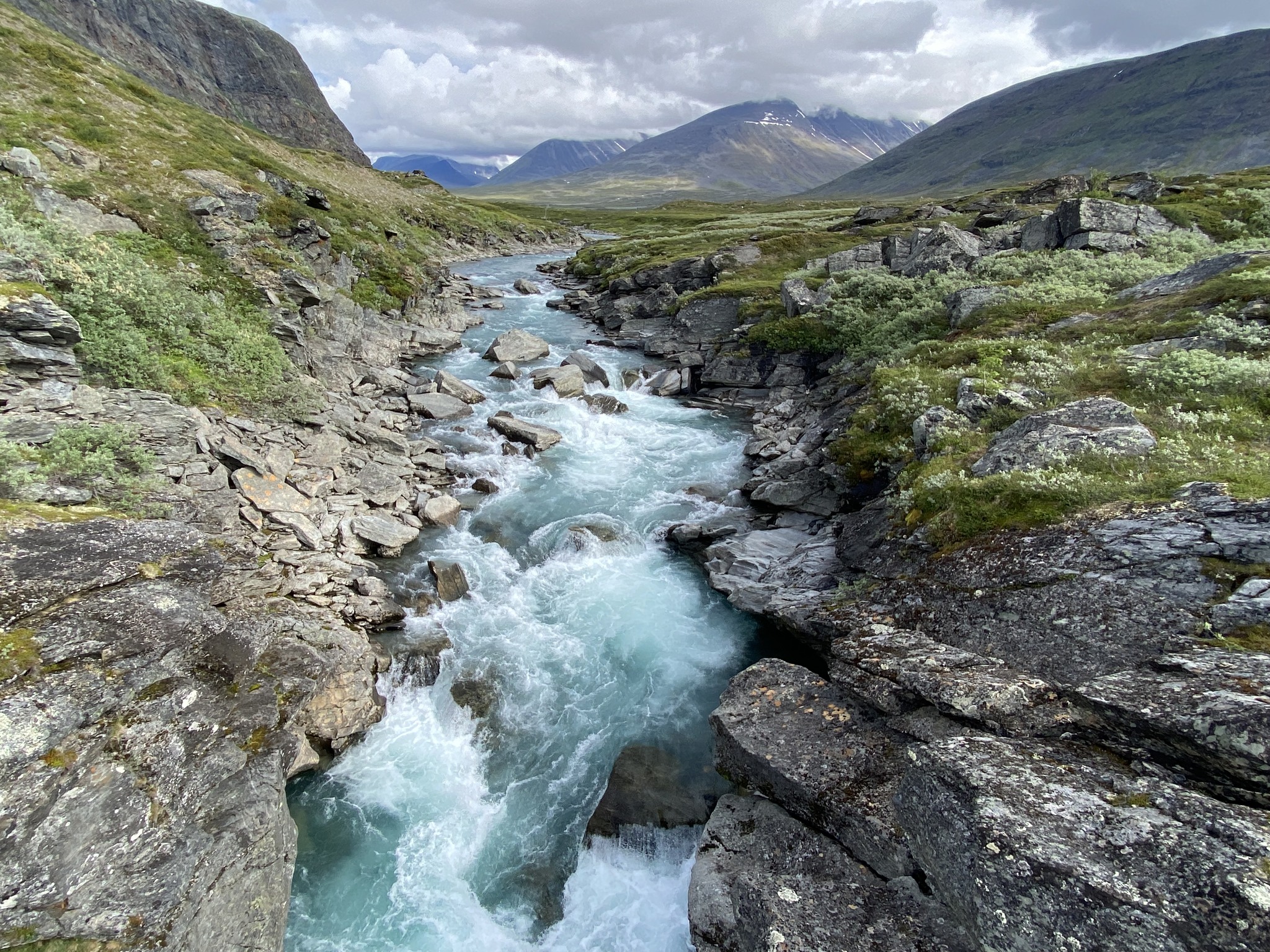 The trail itself was very flat and easy to walk on. After about two-thirds of the distance we crossed the Tjäktjajåkka on a wobbly suspension bridge. From here the landscape changes subtly to light birch forest and numerous willow bushes.