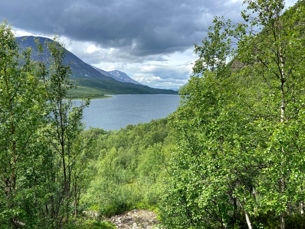After the 1 kilometre boat crossing, the trail continued up a long, gradual climb through mountain birch forest. Eventually, this gave way to brush and grass-covered moors and the hiking became easy.