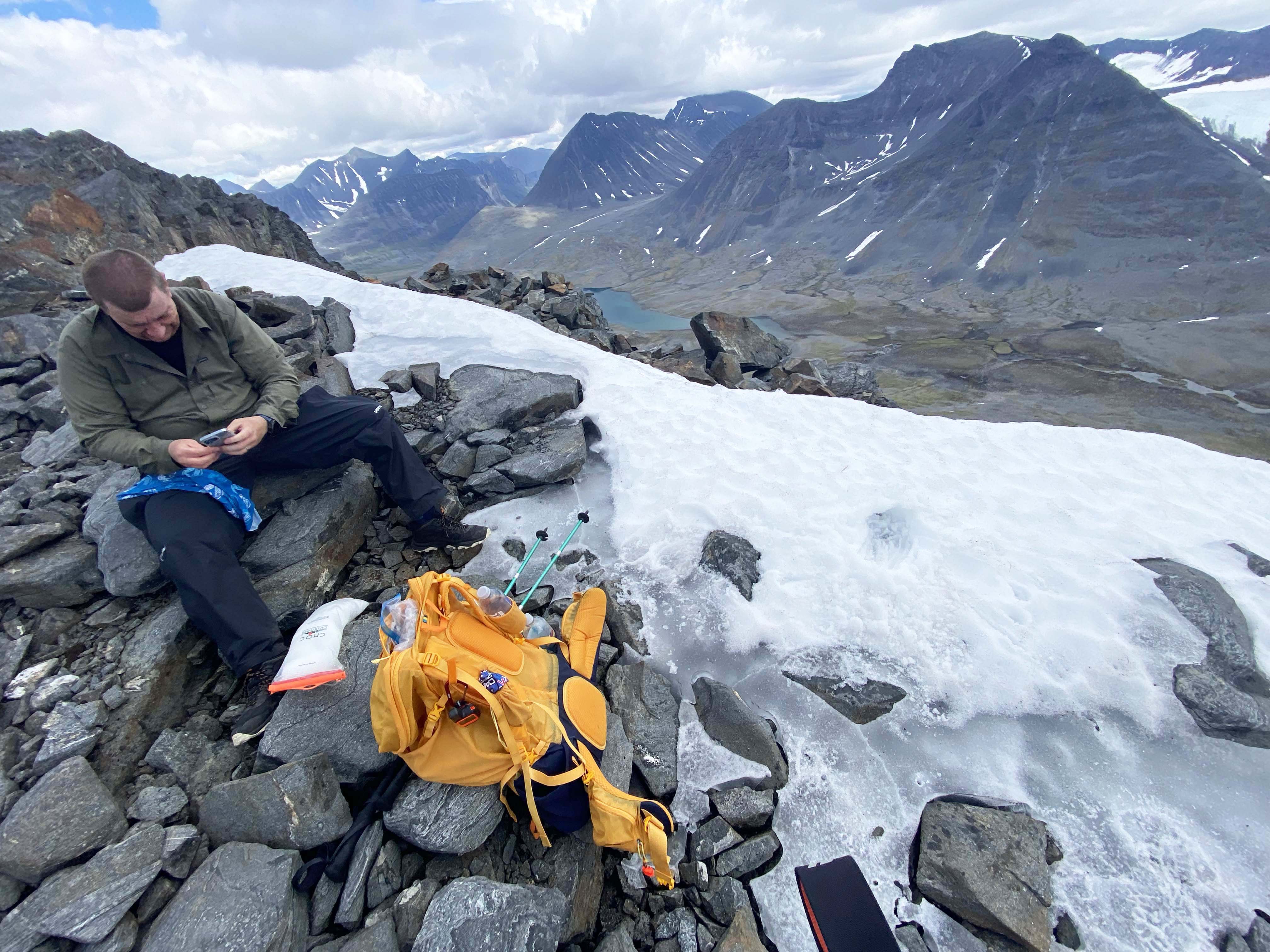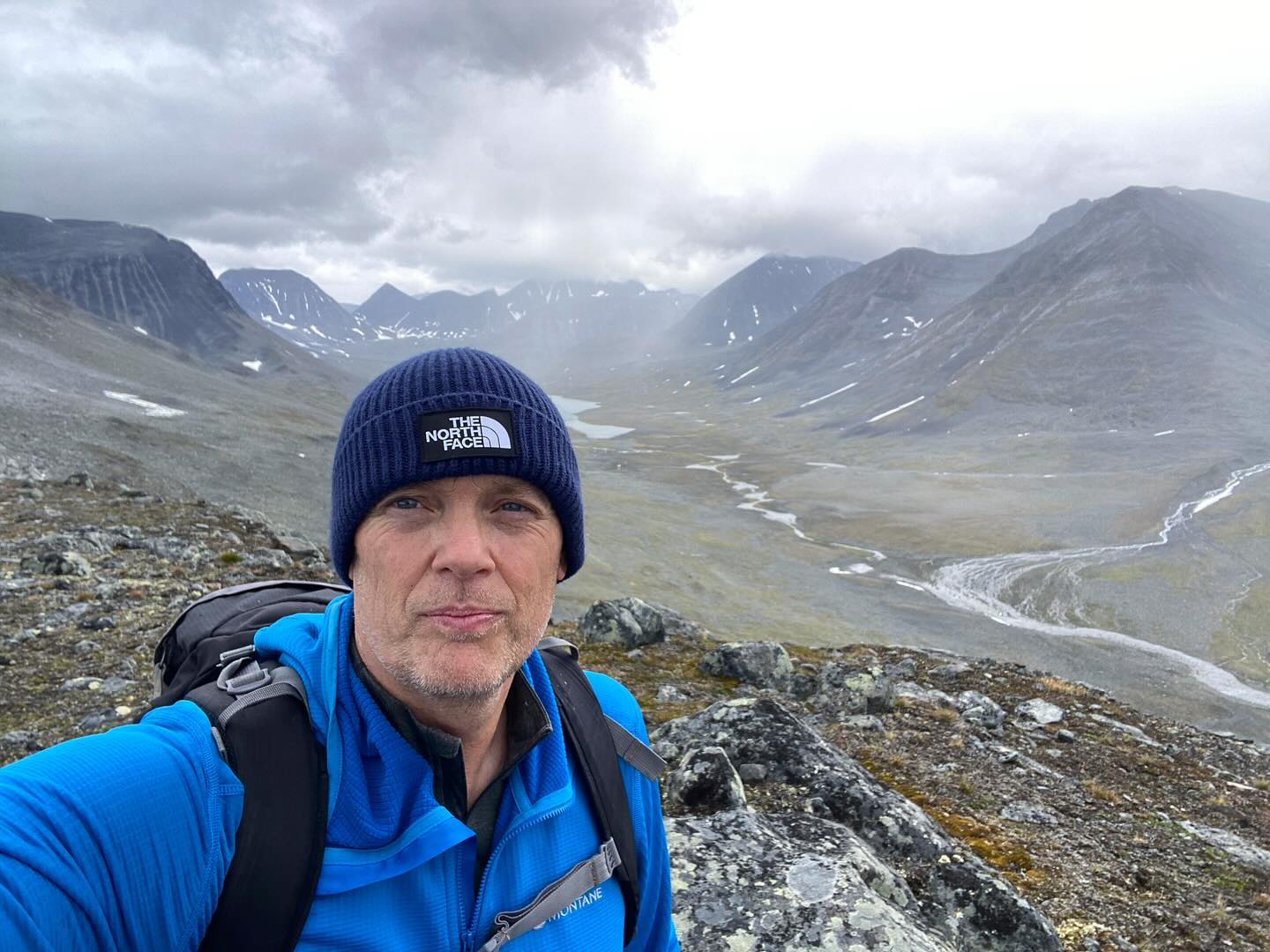 Upon reaching the summit, the weather began to change. A chill wind picked up, and ominous clouds started building along the valley. But the views were sublime across the length of the Tjäktjajåkka Valley.